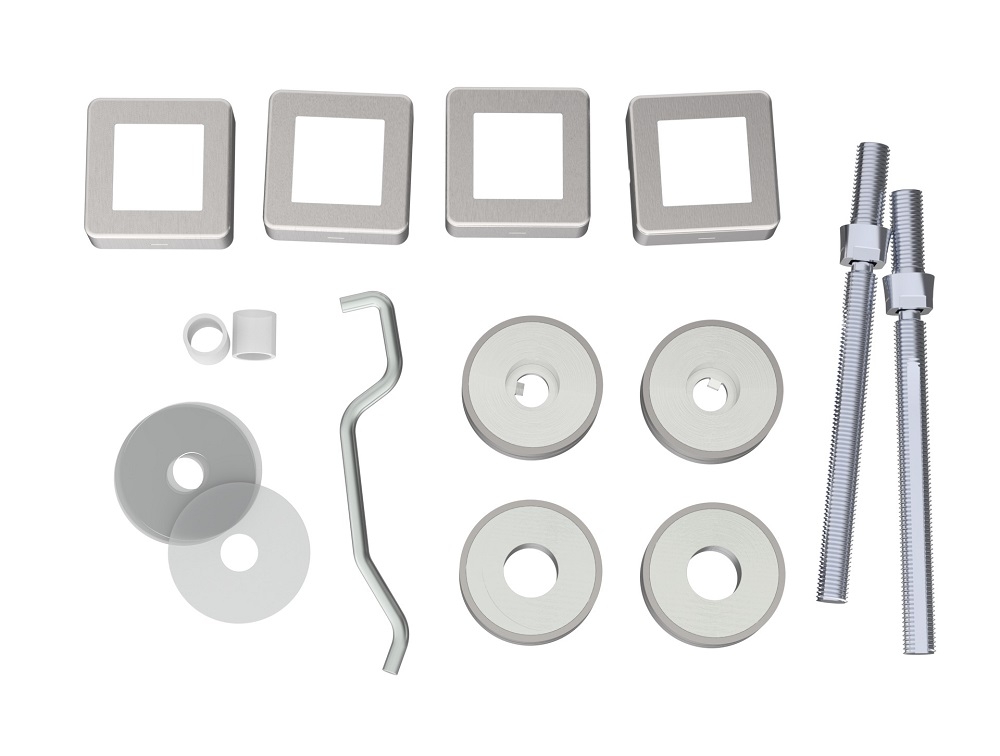 The EUROSPEC® back to back fixing pack includes various components required for installing a 19mm diameter pull handle. The kit is crafted for durability with a satin stainless steel finish, making it ideal for modern applications. The pack contains square plates, round plates, washers, a rod, and threaded bolts, all in a consistent and stylish satin stainless steel finish. This comprehensive fixing pack provides all the necessary parts for secure and stable back-to-back pull handle installation.