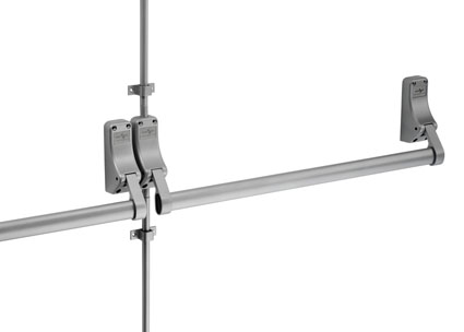 The EUROSPEC® rebated double door push bar panic bolt/latch set is designed for emergency exit applications, ensuring that double doors can be quickly and easily opened in the event of an emergency. It features a robust, metallic design with a sleek silver finish, suitable for commercial and residential use. This push bar panic bolt/latch set enhances safety by providing a reliable and efficient way to secure and open rebated double doors.