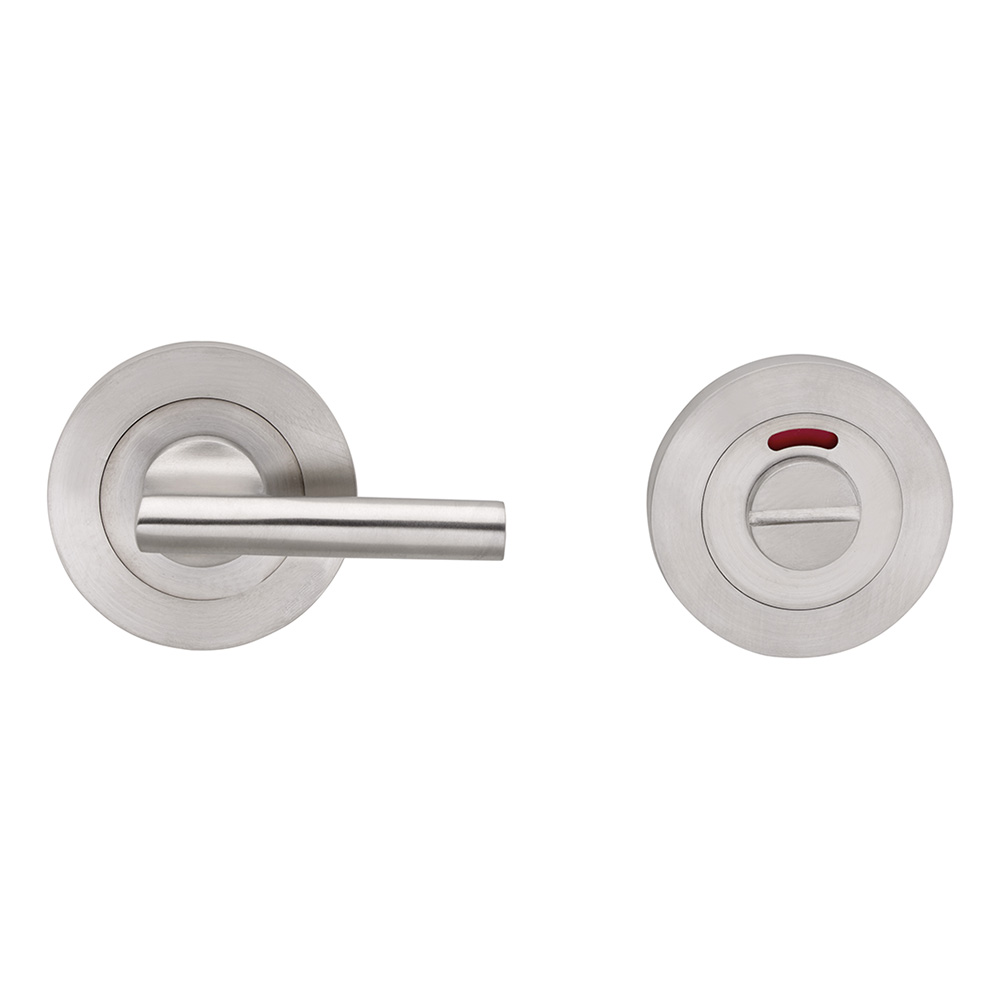 The EUROSPEC® large turn & release with a 5mm spindle is a modern style turn and release mechanism designed to match the SWL Levers. It features a long cylindrical turn for easy operation and a coin release on the other side for emergency access. The indicator includes a colored segment that clearly signals whether it is engaged or vacant. This turn and release is part of the Steelworx range, crafted from grade 304 stainless steel and comes with a 10-year mechanical guarantee. It is suitable for both domestic and commercial use and is fire door rated.
