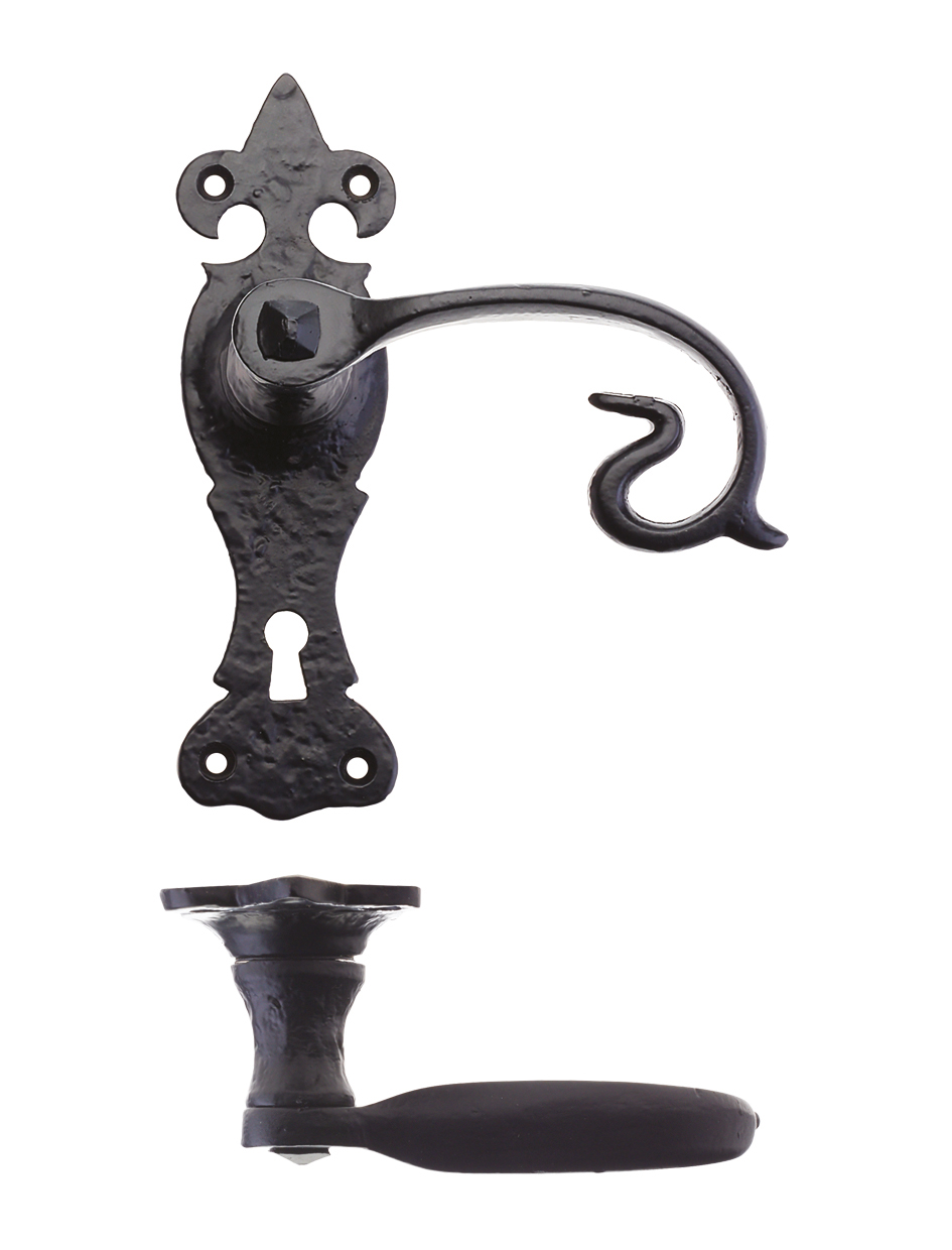 The FOXCOTE FOUNDRIES Scroll Lever on Fleur De Lys Backplate features an elegant traditional design with a distinctive hammered black finish. This decorative door handle kit includes a gracefully curved scroll lever, an ornate 6 inch fleur de lys backplate with integrated keyhole, and spindle mechanism. The face-fix backplate design (48 x 168mm) offers easy installation while the textured black finish provides an authentic period aesthetic perfect for traditional and heritage properties seeking characterful door furniture with a rustic, hand-forged appearance.