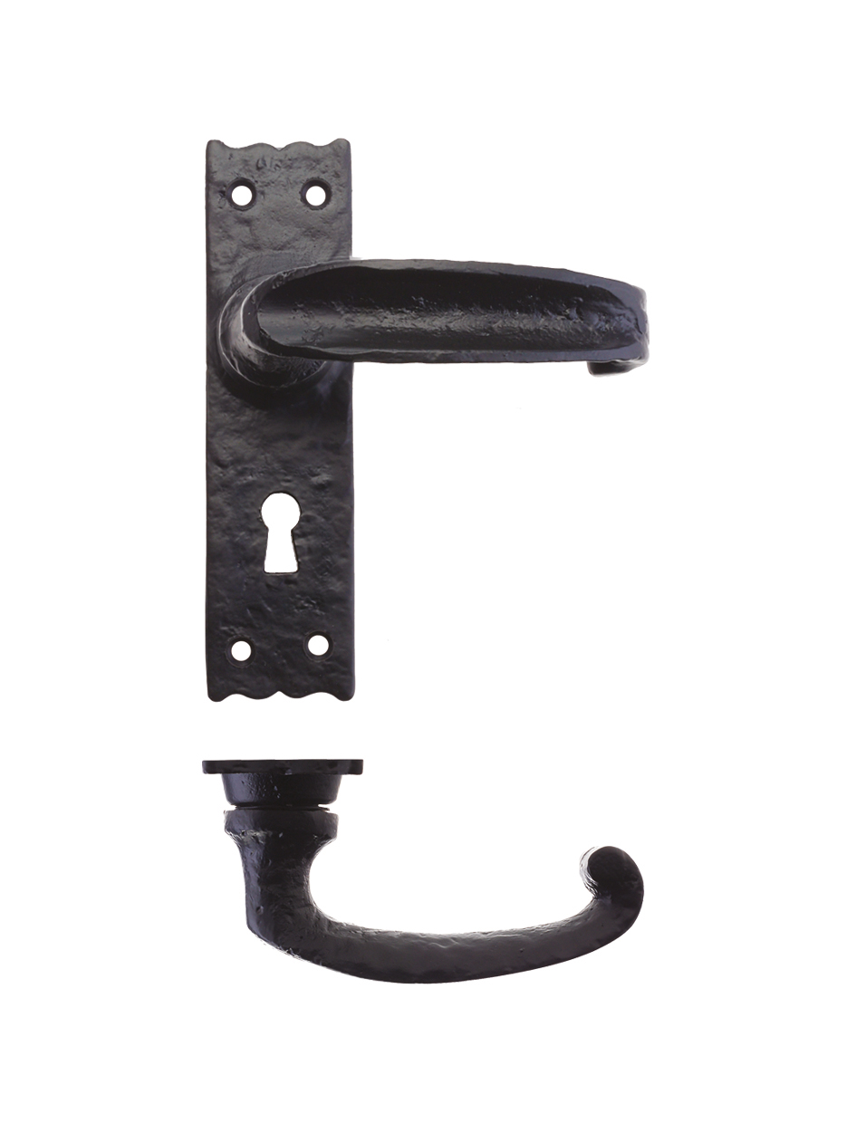 The FOXCOTE FOUNDRIES Traditional Slimline Thumb Lever on Lock Backplate in Black includes a classic thumb lever handle mounted on a decorative lock backplate with keyhole, plus a matching curved door pull. Featuring an authentic hammered texture finish that evokes traditional craftsmanship, this set offers both functionality and period charm. The face-fix backplate design with decorative scalloped edges provides easy installation while adding character to interior doors. The 40 x 142mm backplate dimensions make this an ideal choice for period properties or those seeking a traditional aesthetic with the durability of modern manufacturing.