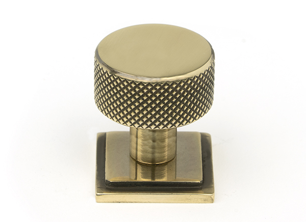 The FROM THE ANVIL® Aged Brass Brompton Cabinet Knob features a contemporary knurled pattern with a textured diamond effect finish. This 25mm diameter knob is mounted on a square rose, creating an elegant contrast between angular and round elements. The aged brass finish offers a beautifully tarnished patina around the edges while maintaining polished surface areas, perfect for period properties. Supplied with stainless steel M4 fixing screw, this knob is ideal for kitchen drawers, cupboards, and doors.