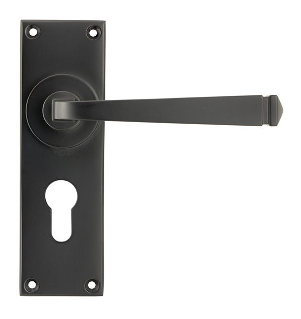 The FROM THE ANVIL® Aged Bronze Avon Lever Euro Lock Set features a timeless and elegant design hand-crafted by expert blacksmiths. The handle incorporates a strong spring mechanism within its stylish boss design, combining both practicality and sophistication. Made from solid bronze with a minimum 85% copper content, the aged bronze finish provides a rich, dark matt appearance protected by a durable lacquer coating. Suitable for both internal and external doors requiring euro lock functionality, this set includes two matching lever handles and comes complete with stainless steel wood screws.