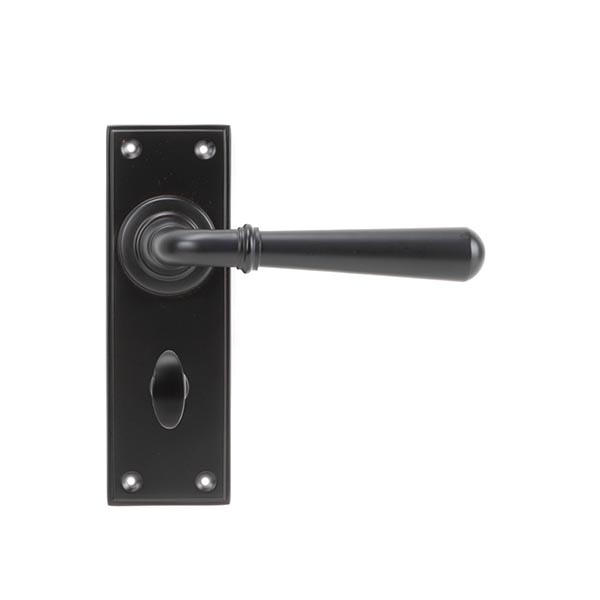 The FROM THE ANVIL® Aged Bronze Newbury Lever Bathroom Set is an elegantly designed bathroom door handle set crafted from solid bronze. The set features a slender, hand-forged design with a sophisticated aged bronze finish that offers a rich, matt appearance. Incorporating a strong spring mechanism within its stylish boss design, this bathroom set combines both practicality and period aesthetics. The set includes lever handles with privacy thumbturn functionality, making it perfect for bathroom and WC applications where privacy is required. Manufactured with at least 85% copper content and protected by a durable matt lacquer, this handle set promises both beauty and longevity.