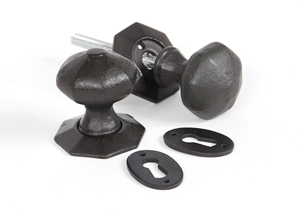 The FROM THE ANVIL® Beeswax Octagonal Mortice/Rim Knob Set offers an authentic, traditional appearance with its distinctive octagonal design. This versatile set includes heavy-duty door knobs finished in a natural beeswax coating that creates a subtle matt richness with unique color variations from blue to deep ochre. The set can be fitted flush to the door or used with rim locks, making it highly adaptable for various door applications. Perfect for creating a cohesive look when matched with octagonal cupboard knobs throughout the home, this set combines historical aesthetics with robust functionality.