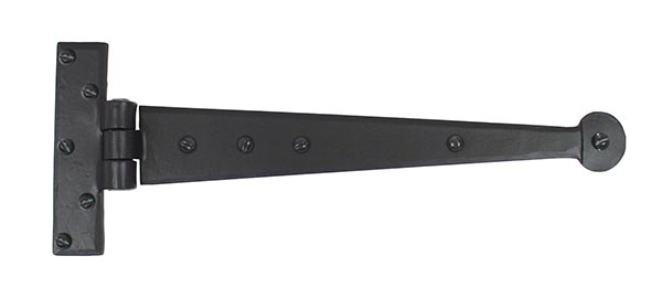 The FROM THE ANVIL® Black 12″ Penny End T Hinges are traditionally crafted T-shaped hinges featuring a distinctive penny end design. These hinges are hammered into shape from mild steel using traditional blacksmith methods with anvil and fire. The durable black finish offers a bold contrast on both stained and painted timber, with a subtle sheen that’s perfect for traditional settings. The hinges come as a pair complete with matching stainless steel wood screws. The baked-on black finish provides excellent corrosion resistance, making them suitable for both interior and exterior applications. Ideal for use with Suffolk latches on traditional plank doors, with the option to use three hinges for heavier doors.