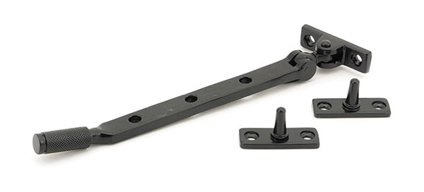 The FROM THE ANVIL® Black 8″ Brompton Stay includes a contemporary designed window stay featuring a distinctive textured, knurled surface with an industrial-style diamond pattern. This hand-forged mild steel window stay comes complete with matching fixing plates and stainless steel wood screws. The durable black finish offers excellent corrosion resistance due to high-temperature oven baking, making it ideal for both traditional and modern settings while providing a bold contrast on stained or painted timber.
