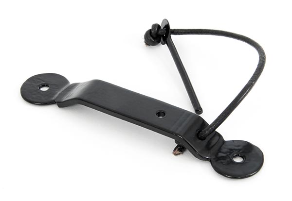 The FROM THE ANVIL® Black Locking Penny End Screw on Staple is a durable replacement component for thumblatch sets, featuring a high-quality black baked finish for corrosion resistance. Includes an integrated leather strap and locking pin for privacy functionality. This screw-on design is ideal for thinner doors where traditional drive-in staples may not be suitable. Supplied complete with matching stainless steel wood screws, this staple provides both functional reliability and aesthetic appeal with its subtle sheen that perfectly complements both stained and painted timber.