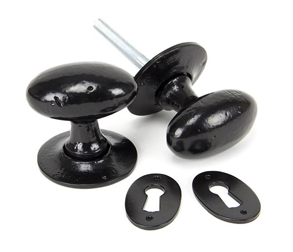 The FROM THE ANVIL® Black Oval Mortice/Rim Knob Set is a classic blacksmith-style door hardware kit featuring elegant oval-shaped knobs with a durable baked black finish. The set includes a pair of substantial oval door knobs, matching keyhole escutcheons, and mounting hardware. The versatile design allows for both mortice and rim lock applications, with a loose collar enabling flush or raised mounting. The high-temperature baked finish provides excellent corrosion resistance while offering beautiful contrast on both stained and painted doors.