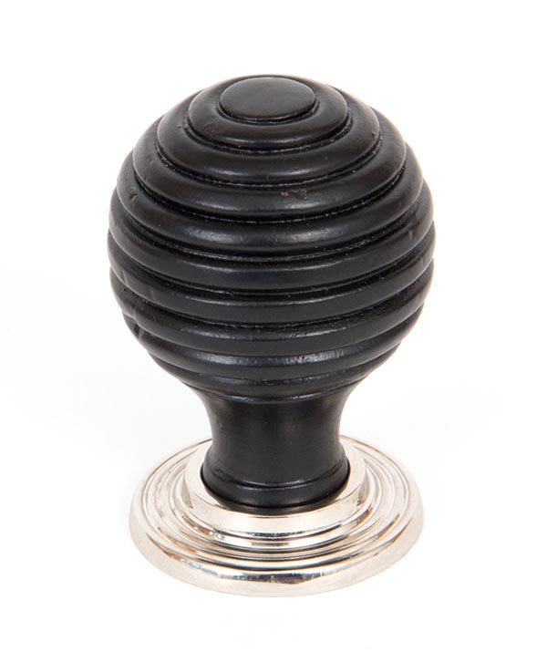 The FROM THE ANVIL® Ebony and Polished Nickel Beehive Cabinet Knob features a distinctive beehive-style design with elegant ribbed detailing. The 35mm knob combines a rich ebonized wood finish with a polished nickel rose base, creating a sophisticated contrast ideal for both traditional and contemporary interiors. Perfect for cupboards, doors, and drawers, this versatile knob comes complete with stainless steel fixing screws for easy installation.