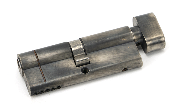 The FROM THE ANVIL® Pewter 40/40 5pin Euro Cylinder/Thumbturn includes a high-security cylinder lock mechanism featuring anti-pick, anti-snap, and anti-bump protection. This 40mm x 40mm cylinder offers convenient thumbturn operation from the inside while requiring a key from the outside. Manufactured from solid brass with a sophisticated pewter patina finish, it comes supplied with 3 keys and can be keyed alike with other cylinders for unified access. Perfect for use with euro or espagnolette lock handles and multi-point locking systems.