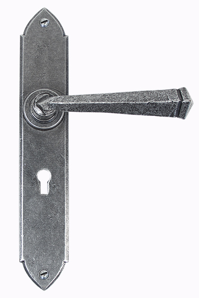 The FROM THE ANVIL® Pewter Gothic Lever Lock Set is a beautifully crafted Medieval-inspired door handle featuring a distinctive Gothic design. The hand-hammered lever and decorative backplate showcase a rich pewter patina finish that adds character and authenticity. The handle incorporates a robust spring mechanism within its elegant boss design, combining both style and functionality. Suitable for both internal and external doors requiring locking capability, this set includes handles for both sides of the door and is compatible with 5-lever sash locks. The contrasting textures and luxurious pewter finish make it perfect for both traditional period properties and contemporary settings seeking a distinctive architectural detail.