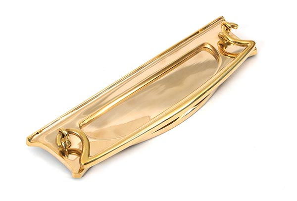 The FROM THE ANVIL® Polished Brass Art Deco Letter Plate is an elegant and sophisticated door accessory featuring a classic Art Deco design with a stunning polished brass finish. The letterplate includes an integrated traditional door knocker and offers both functional and decorative value. Made from solid unlacquered brass, this piece will naturally develop a beautiful patina over time if left untreated, or can be easily maintained to retain its bright polished appearance with regular polishing. Suitable for doors up to 60mm thick, this letterplate comes complete with matching threaded bolts and dome-headed caps for installation.