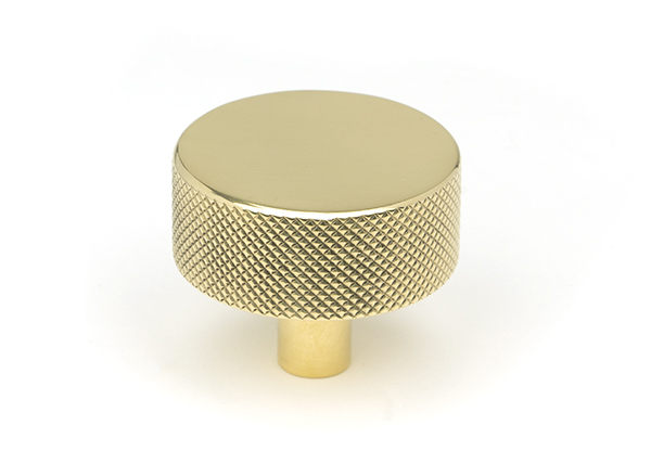 The FROM THE ANVIL® Polished Brass Brompton Cabinet Knob features a contemporary knurled pattern with an elegant diamond textured finish. Made from solid unlacquered brass, this 38mm cabinet knob offers a luxurious golden hue perfect for both period and contemporary properties. The simplistic design without a rose creates a clean, modern look ideal for kitchen drawers, cupboards, and doors. Supplied with a stainless steel M4 screw, this knob will naturally patinate over time for a beautiful aged appearance, though it can be easily restored to its original shine with simple polishing.