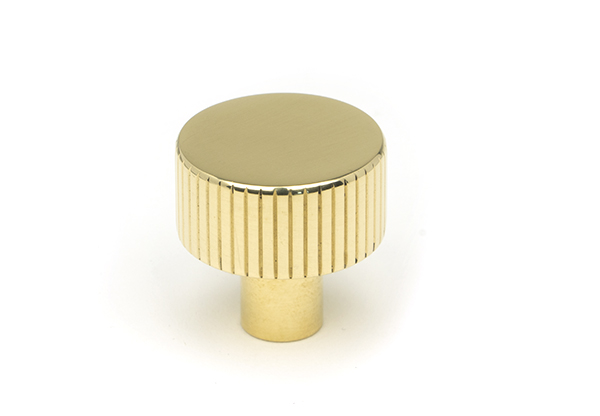 The FROM THE ANVIL® Polished Brass Judd Cabinet Knob features a contemporary design with elegant parallel lines that showcase exceptional craftsmanship. Made from solid unlacquered brass, this 25mm knob offers a luxurious polished finish with soft golden hues. Perfect for kitchen drawers, cupboards, or doors, it comes without a rose for a minimalist look and includes a stainless steel M4 fixing screw. The unlacquered finish will naturally patinate over time, creating a beautiful aged appearance that can be easily restored to its original shine with simple polishing.