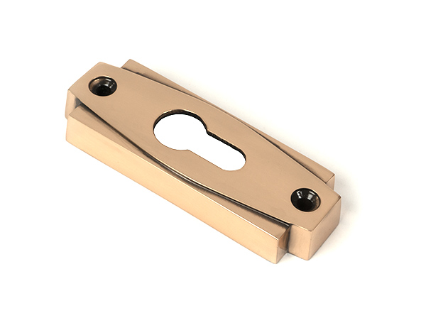 The FROM THE ANVIL® Polished Bronze Art Deco Euro Escutcheon combines timeless elegance with modern functionality. This sophisticated door hardware features a stepped backplate with clean, geometric styling characteristic of the Art Deco period. Manufactured from solid bronze with a minimum 85% copper content, the escutcheon undergoes a special aging and re-polishing process to create subtle contrasts between light and dark areas, protected by a robust lacquer finish. Perfect for both contemporary and traditional settings, this euro profile escutcheon comes complete with matching stainless steel wood screws.