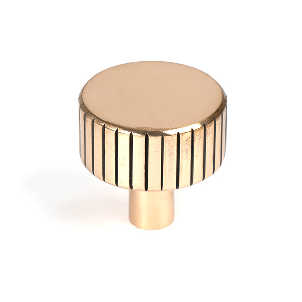 The FROM THE ANVIL® Polished Bronze Judd Cabinet Knob features a contemporary design with elegant parallel lines that showcase exceptional blacksmith craftsmanship. Made from solid bronze with a minimum 85% copper content, this 32mm knob boasts a striking polished bronze finish that contrasts lighter surfaces against darker detailed areas. Protected by a robust lacquer coating, this modern knob is supplied with a stainless steel M4 screw and is perfect for kitchen drawers, cupboards, and doors where a sophisticated, minimalist look is desired.