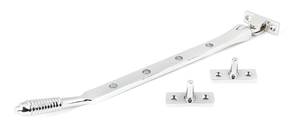 The FROM THE ANVIL® Polished Chrome 10″ Reeded Stay includes a beautifully crafted window stay featuring a classic regency design with an elegant reeded end. Forged from solid brass with a high-shine polished chrome finish, this premium stay combines traditional craftsmanship with contemporary styling. The weighty construction and expert hand-finishing of the reeded detail showcase its quality, while the durable chrome plating provides a bold, mirror-like appearance. Complete with matching stainless steel wood screws and fixing plates, this stay is perfect for both traditional and modern window installations.