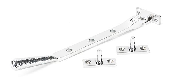 The FROM THE ANVIL® Polished Chrome 8″ Hammered Newbury Stay is a beautifully crafted window stay featuring a distinctive hand-hammered texture created by skilled blacksmiths. Made from solid brass with a high-sheen polished chrome finish, this window stay combines contemporary elegance with traditional craftsmanship. The kit includes a main stay arm and mounting brackets, complete with matching stainless steel wood screws. Perfect for adding a touch of luxury to modern window installations while ensuring reliable functionality.