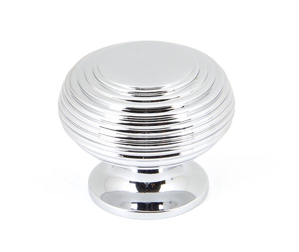 The FROM THE ANVIL® Polished Chrome Beehive Cabinet Knob features an elegant beehive design forged from solid brass with a high-shine polished chrome finish. This versatile 40mm knob includes an SS M4 screw and is perfect for cupboards, doors, and drawers. The distinctive stepped dome design adds a sophisticated touch to any interior, combining contemporary style with traditional craftsmanship.