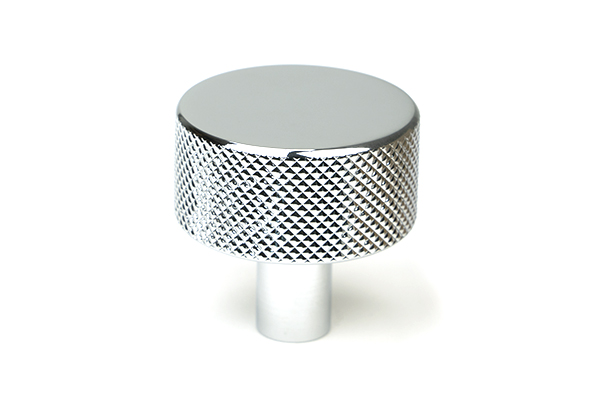 The FROM THE ANVIL® Polished Chrome Brompton Cabinet Knob features a contemporary knurled pattern with a sophisticated diamond-textured finish. This 32mm cabinet knob showcases an industrial-inspired design with a high-sheen polished chrome finish over solid brass construction. Perfect for modern kitchen drawers, cupboards, and doors, it comes supplied with a stainless steel M4 fixing screw. The no-rose design offers a clean, minimalist look that enhances contemporary interiors.