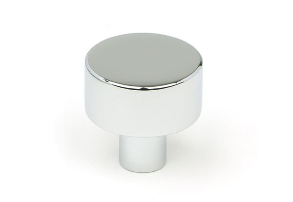 The FROM THE ANVIL® Polished Chrome Kelso Cabinet Knob features a timeless, minimalist design perfect for contemporary interiors. This 25mm diameter knob comes without a rose for a clean, simplistic look and includes a stainless steel M4 mounting screw. The high-sheen polished chrome finish over solid brass base provides both durability and elegant styling, making it an ideal choice for kitchen drawers, cupboards, and doors.