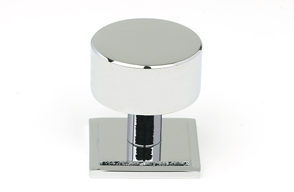 The FROM THE ANVIL® Polished Chrome Kelso Cabinet Knob features a timeless and versatile design combining a round 32mm diameter knob with a contemporary square rose base. Made from solid brass with a high-sheen polished chrome finish, this cabinet knob offers a modern, clean aesthetic suitable for kitchen drawers, cupboards, and doors. The simple yet elegant design includes a 32mm x 32mm square rose that provides an appealing angular contrast to the circular knob, projecting 36mm from the mounting surface. Supplied with stainless steel M4 mounting hardware.