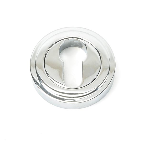 The FROM THE ANVIL® Polished Chrome Round Euro Escutcheon features a sophisticated Art Deco stepped design that adds a contemporary edge to traditional styling. Made from solid brass with a high-sheen polished chrome finish, this escutcheon provides an elegant finishing touch for euro profile locks. The concealed fixing design ensures a clean, seamless appearance, while the durable chrome plating offers excellent longevity. Supplied with matching stainless steel wood screws, this escutcheon perfectly complements modern door furniture and creates a bold, bright accent for any door.