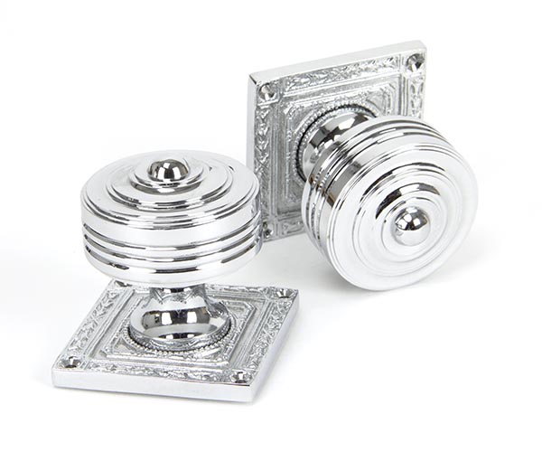 The FROM THE ANVIL® Polished Chrome Tewkesbury Square Mortice Knob Set is an elegantly crafted door furniture set featuring decorative Georgian-inspired design. The set includes solid brass knobs with a high-shine polished chrome finish and ornately detailed square roses. Forged from solid brass and hand-finished by expert craftsmen, these substantial knobs measure 54mm in diameter and are ideal for period properties. Compatible with various heavy-duty locks and latches, the set comes complete with matching stainless steel wood screws and ensures reliable performance with strong spring return action.