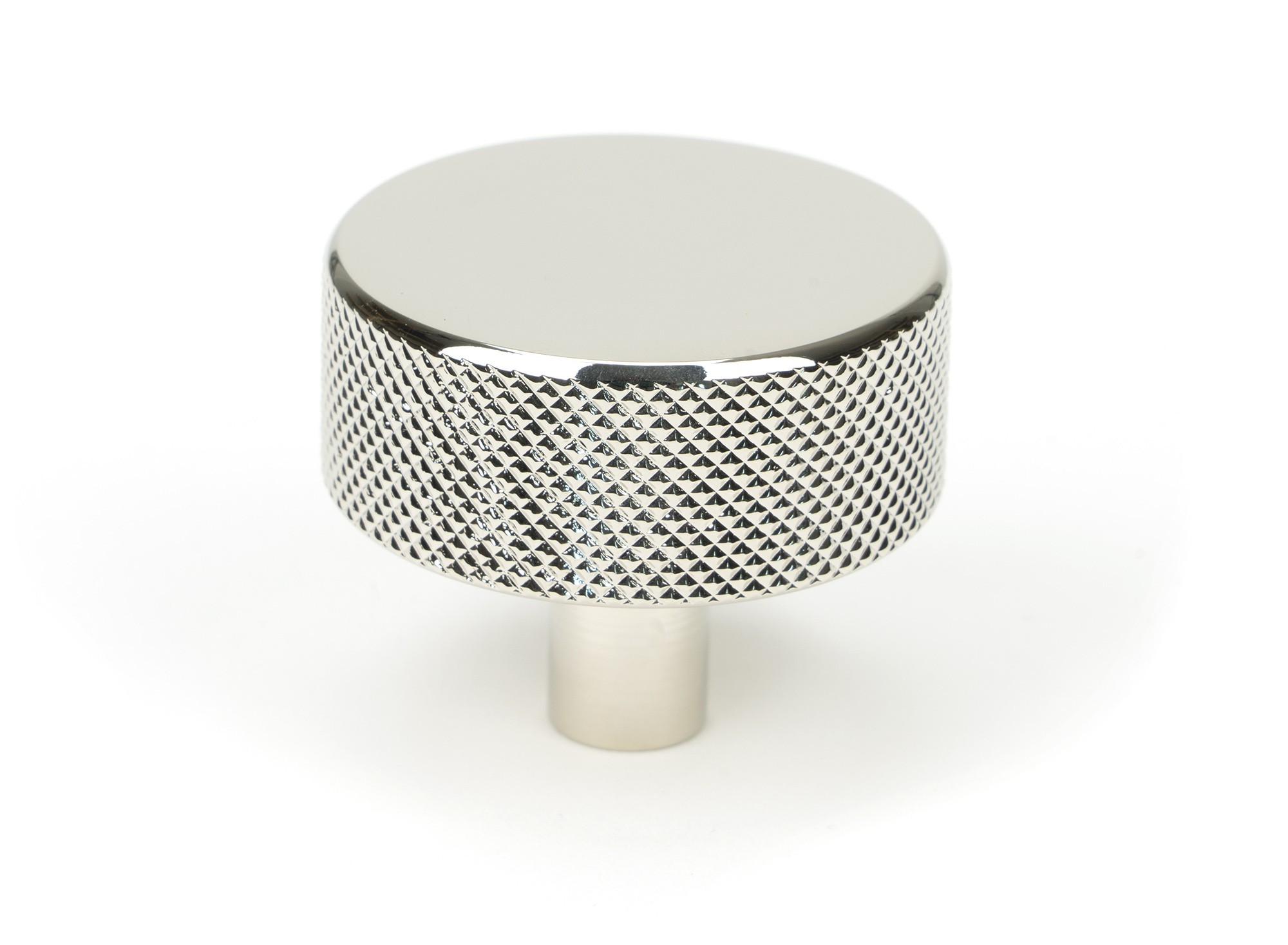The FROM THE ANVIL® Polished Nickel Brompton Cabinet Knob features a contemporary knurled pattern with an elegant diamond-textured surface. This 38mm cabinet knob showcases a bright, reflective polished nickel finish on solid brass, making it suitable for both modern and traditional settings. The clean design without a rose offers a minimalist aesthetic, perfect for kitchen drawers, cupboards, and doors. Supplied with a stainless steel M4 mounting screw, this knob combines industrial styling with sophisticated functionality.