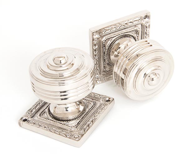 The FROM THE ANVIL® Polished Nickel Tewkesbury Square Mortice Knob Set includes elegantly designed door knobs inspired by classic Georgian styling. Each knob is forged from solid brass with a high-quality polished nickel finish, featuring decorative square backplates with intricate pattern detail. The bright, reflective finish offers impressive depth and versatility, making it suitable for both modern and traditional settings. The set is expertly crafted with heavy-duty construction ensuring reliable performance and comes complete with matching stainless steel wood screws.