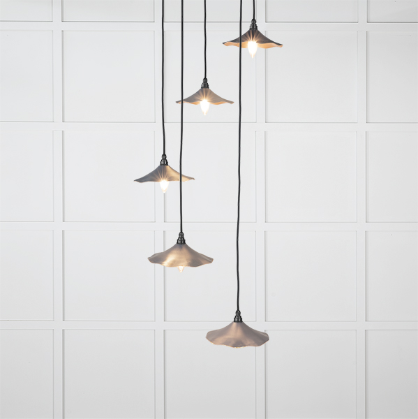 The FROM THE ANVIL® Smooth Copper Flora Cluster Pendant features five elegant pendant lights inspired by natural floral forms. Each spun copper shade creates a warm, ambient glow with delicate curves that beautifully disperse light. The cluster arrangement hangs at varying heights up to 1.3m, making it a stunning focal point for high-ceilinged spaces. Compatible with dimmable LED bulbs for customizable lighting control, this statement piece combines artistic design with practical functionality. The smooth copper finish provides a subtle, warm aesthetic that pairs perfectly with cooler LED bulbs.