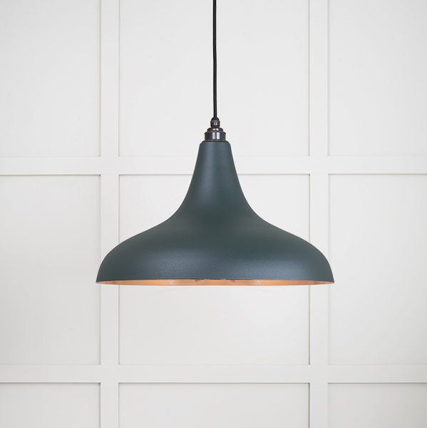 The FROM THE ANVIL® Smooth Copper Frankley Pendant features a sleek, contemporary design with a stunning dingle green exterior and warm copper interior. The versatile pendant creates an eye-catching statement whether hung individually or grouped. The pendant comes complete with a matching ceiling rose and 1m of black fabric cable. Compatible with dimmable LED bulbs up to 6W, this pendant provides both style and functionality for modern interiors.