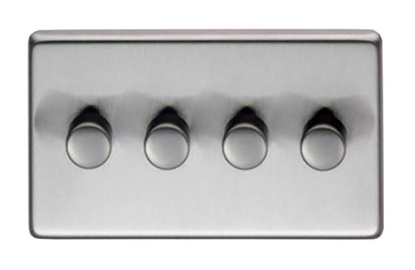 The FROM THE ANVIL® SSS Quad LED Dimmer Switch is a premium quality four-gang LED dimmer switch featuring a sophisticated satin stainless steel finish. The switch plate measures 146mm x 86mm with a slim 7mm profile, designed to complement pewter, polished nickel, polished chrome or satin chrome ironmongery. The stainless steel construction provides excellent protection against rusting and oxidization. Supplied complete with matching stainless steel wood screws, this dimmer switch is perfect for controlling multiple LED lighting circuits with style and precision.