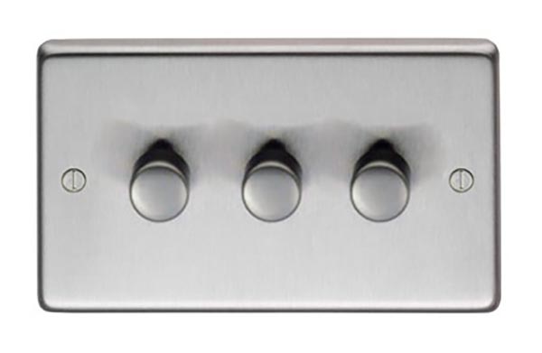 The FROM THE ANVIL® SSS Triple LED Dimmer Switch is a premium quality electrical control featuring three independent dimmer controls in an elegant satin stainless steel finish. The switch plate measures 146mm x 86mm with a slim 7mm profile, designed to complement modern interior aesthetics. Perfect for controlling multiple LED light circuits, this switch offers seamless dimming functionality while matching perfectly with pewter, polished nickel, polished chrome, or satin chrome fixtures. The stainless steel construction provides excellent protection against rusting and oxidization, ensuring long-lasting durability.
