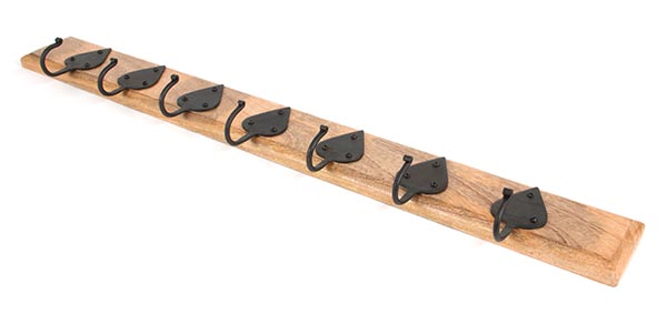 The FROM THE ANVIL® Timber Cottage Coat Rack combines rustic charm with practical functionality, featuring seven Gothic-style hooks finished in authentic beeswax mounted on a beautifully stained timber backboard. The coat rack offers an elegant storage solution for entranceways, hallways, and utility rooms, with its generous 900mm length providing ample hanging space. The beeswax finish creates a subtle matt richness with natural color variations from blue to deep ochre, providing a softer alternative to black powder coating. Hidden fixing plates ensure clean, professional installation.