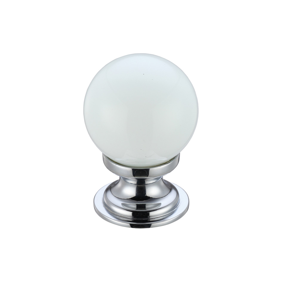The FULTON & BRAY Glass Ball Cabinet Knob features an elegant 30mm white glass spherical knob mounted on a polished chrome base, offering a classic and timeless design. This high-quality cabinet knob combines the smooth, clean appearance of white glass with the lustrous shine of polished chrome, making it an ideal choice for updating kitchen cabinets, bathroom vanities, or furniture pieces. The substantial glass ball provides a comfortable grip while adding a touch of sophistication to any interior décor scheme.