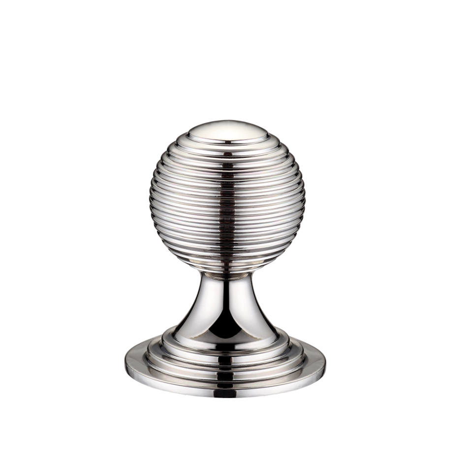The FULTON & BRAY Queen Anne Ringed Knob features an elegant spherical design with distinctive horizontal ribbed detailing, creating a classic Queen Anne aesthetic. Finished in lacquered polished nickel, this knob offers a bright, reflective surface that combines traditional styling with modern durability. The 32mm rose diameter provides a substantial base, making it suitable for both cabinet doors and drawers. The lacquered finish helps protect against tarnishing and wear, ensuring long-lasting beauty in your home.