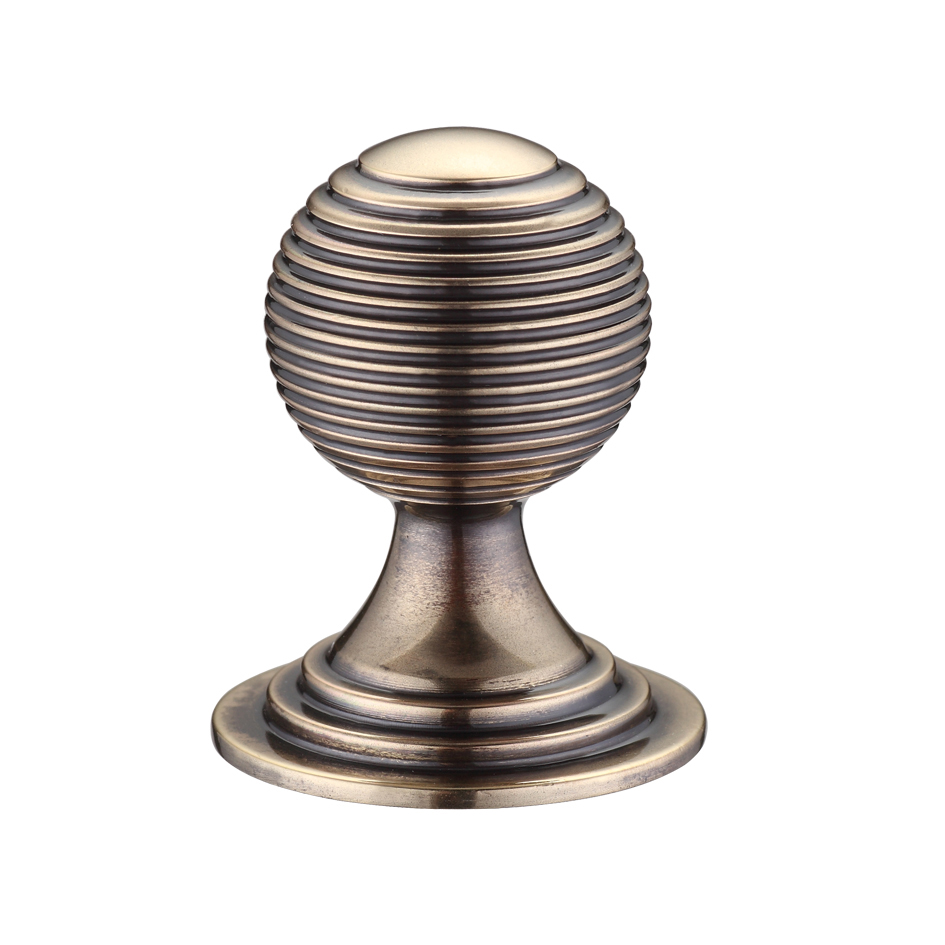 The FULTON & BRAY Queen Anne Ringed Knob features an elegant spherical design with distinctive horizontal ribbed detailing and a smooth cream-colored top insert. Finished in sophisticated Florentine Bronze, this 38mm diameter rose mortice knob combines traditional styling with quality craftsmanship, making it an ideal choice for period properties or homes seeking a classic, timeless aesthetic. The ringed ball design provides excellent grip while adding decorative appeal to any door.
