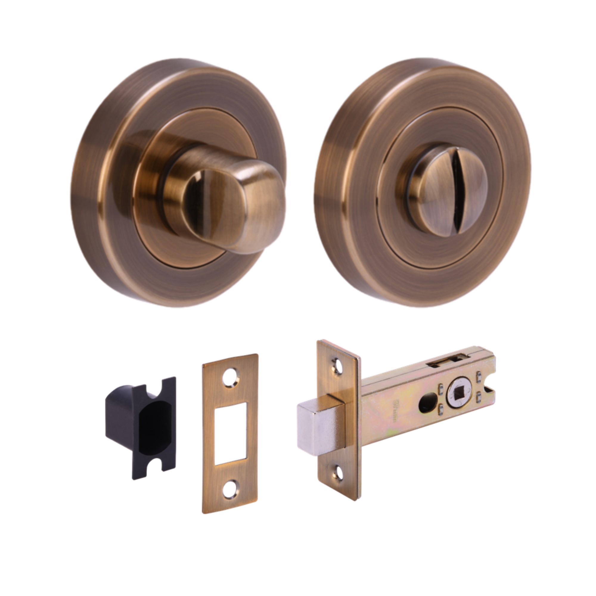 The HUNTA® Antique Bronze Bathroom Turn / Release Accessory Doorpack is a comprehensive solution designed for bathroom doors with a backset distance of 57mm. The kit exhibits an elegant antique bronze finish that complements the Hunta Designer Lever on Rose range and adds a sophisticated touch to any bathroom door setup. It includes a bathroom turn/release mechanism that facilitates privacy and safety, and also features a coin release for emergency access, ensuring practicality in a variety of situations. The kit is compatible with door thicknesses between 35mm and 44mm, offering versatility for different door specifications. Additionally, it is non-handed, meaning it can be used on both left and right-hand opening doors. The kit comes with the necessary bolt-through fixings, a 5mm spindle, and wood screws for a secure and straightforward installation. The components are made from zinc, promising durability and long-lasting performance. The rose/backplate’s concealed screw design ensures a clean, flush finish on the door surface, showcasing the kit’s attention to aesthetics as well as function.