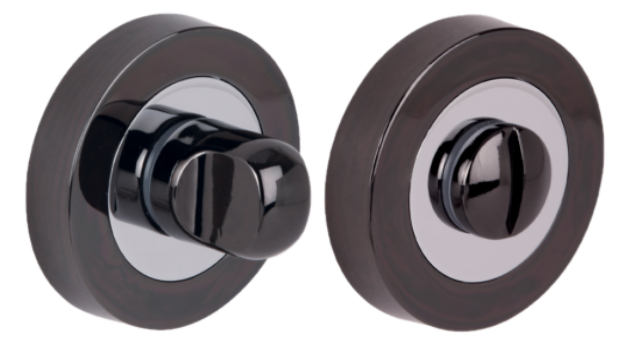The HUNTA® Bathroom Turn/Release Black Nickel-Polished Chrome plated kit is designed for use with bathroom locks or bathroom deadbolts, providing privacy and safety in bathroom settings. The high-quality finish in black nickel and polished chrome gives the accessories a sleek and sophisticated aesthetic. The turn/release mechanism allows for easy locking and unlocking from the inside, while the coin release offers emergency access from the outside. This kit is suitable for doors ranging from 35mm to 44mm in thickness and is part of the accessory range for Hunta Lever on Rose collection. It includes bolt through fixings and a 5mm spindle as well as wood screws, ensuring a secure and concealed mount.