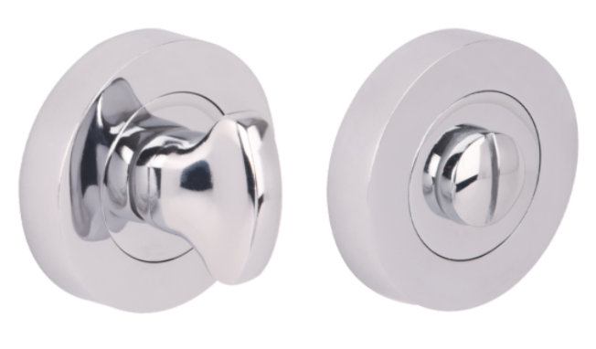 The HUNTA® Bathroom Turn/Release Kit in Polished Chrome Plated finish is a modern and stylish bathroom privacy accessory set, designed to complement the Hunta Lever on Rose door handle ranges. Constructed from high-quality zinc, the kit features a polished chrome coating that enhances its durability and aesthetic appeal. This set includes a turn knob for engaging a bathroom lock or deadbolt, as well as a safety coin release for emergency access, ensuring privacy and security. It is suitable for door thicknesses ranging from 35mm to 44mm. The concealed screw rose design creates a sleek and unobtrusive look, while the included 5mm spindle and wood screws make installation straightforward. This kit is an ideal choice for completing the look and functionality of a bathroom lock mechanism, combining modern design with practical features.