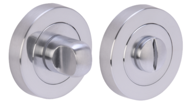 The HUNTA® Bathroom Turn/Release is a satin chrome-plated accessory designed for bathroom privacy. It features a turn knob for engaging the lock from the inside and a coin slot for emergency release from the outside, ensuring privacy and safety. This product is ideal for doors with a thickness ranging from 35mm to 44mm and is a compatible accessory for the Hunta Lever on Rose ranges. The component’s high-quality finish provides durability and elegance to bathroom doors, and it is supplied with the necessary wood screws and a 5mm spindle for installation. Bolt-through fixings ensure secure attachment to the door.