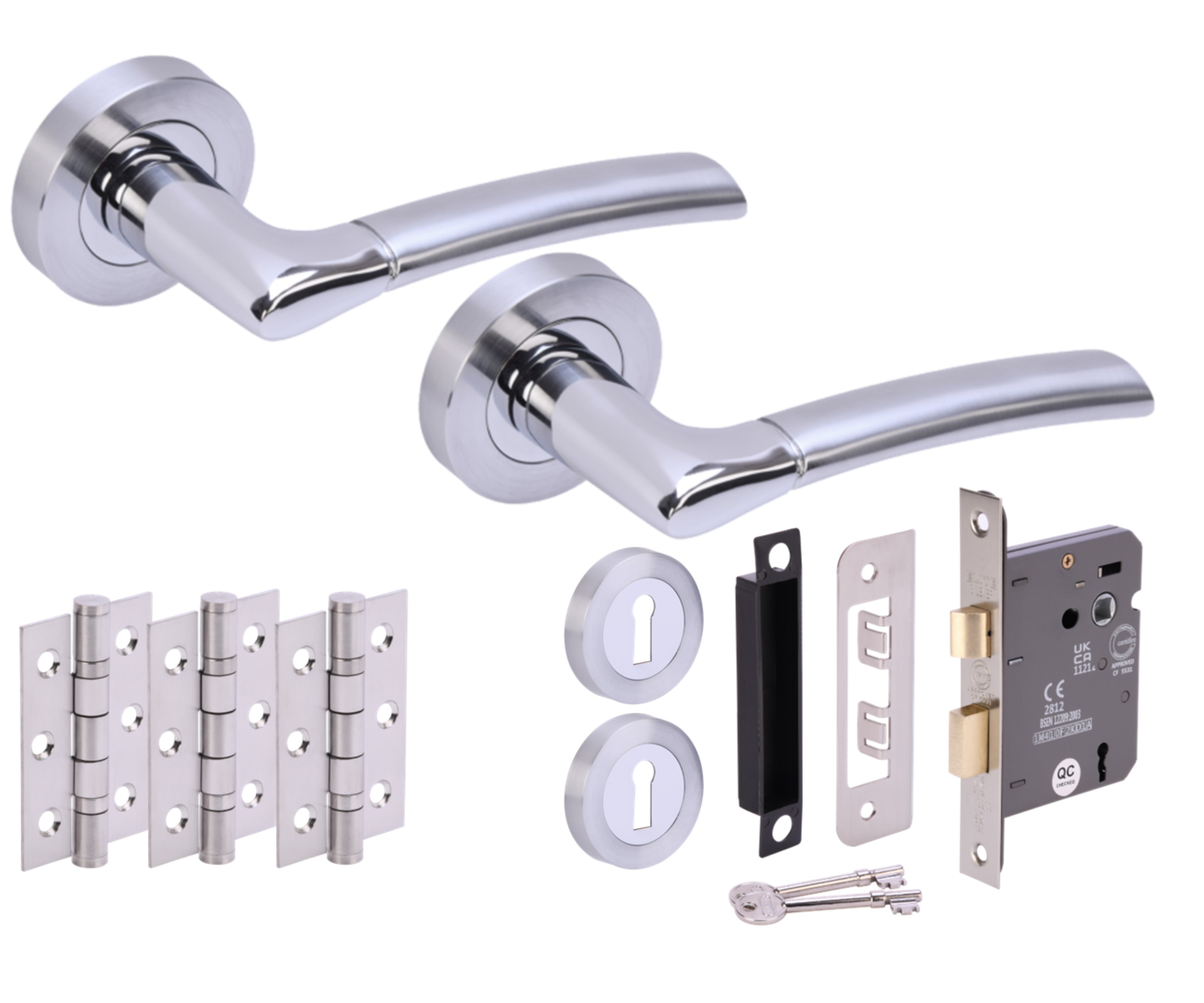 The HUNTA® COLUMBA Polished Chrome plated/Satin Chrome plated Sashlock Doorpack is a comprehensive door hardware set designed to provide all the necessary components for installing a sash lock door mechanism. This doorpack includes a passage lever set exhibiting a modern dual finish with a designer lever on rose, three 76mm hinges for secure door attachment, and a CE marked 3L sashlock complete with a box keep for enhanced security. Two matching escutcheons complete the polished look, and the kit is suitable for doors ranging from 35mm to 44mm in thickness. The parts feature a combination of polished and satin chrome finishes, lending elegance and resilience to the set. The kit also includes essential bolt-through fixing bolts to ensure a sturdy and durable fitting.