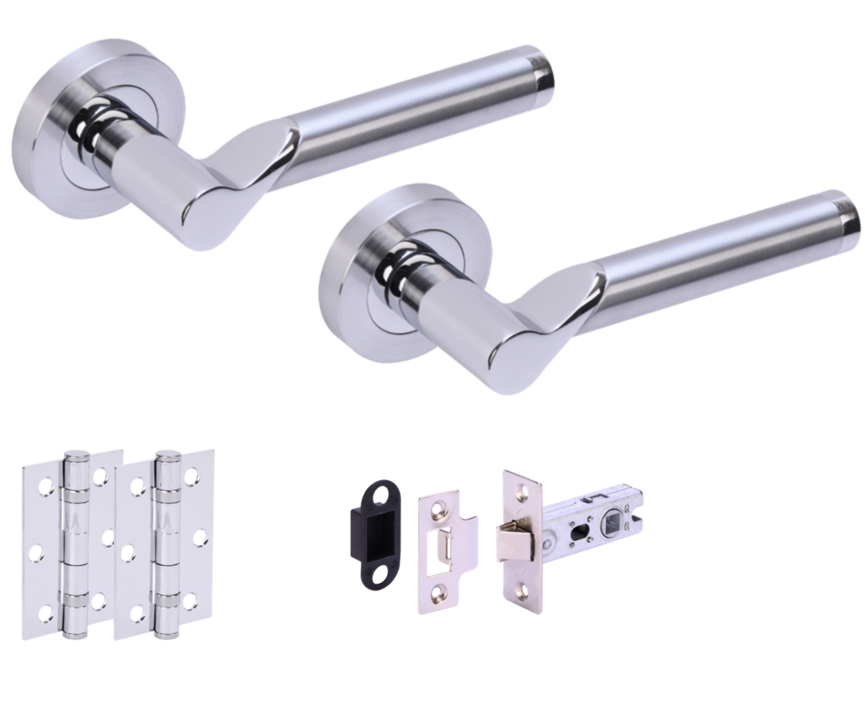 The HUNTA® HYDRUS Doorpack features a passage lever set with a stylish dual finish combining polished chrome and satin chrome, providing a contemporary look suitable for various door designs. This extensive kit includes a pair of hinges and a standard contract latch with a matching box keep. Designed to fit doors with thickness ranging from 35mm to 44mm, this lever door pack is a complete solution for non-locking interior doors, commonly used in passages. Additional matching bathroom turn/release sets and escutcheons are available to complement this setup. The lever set is supplied with bolt-through fixing bolts that ensure a secure mount, while the concealed screw rose backplate enhances the aesthetic with a clean finish.
