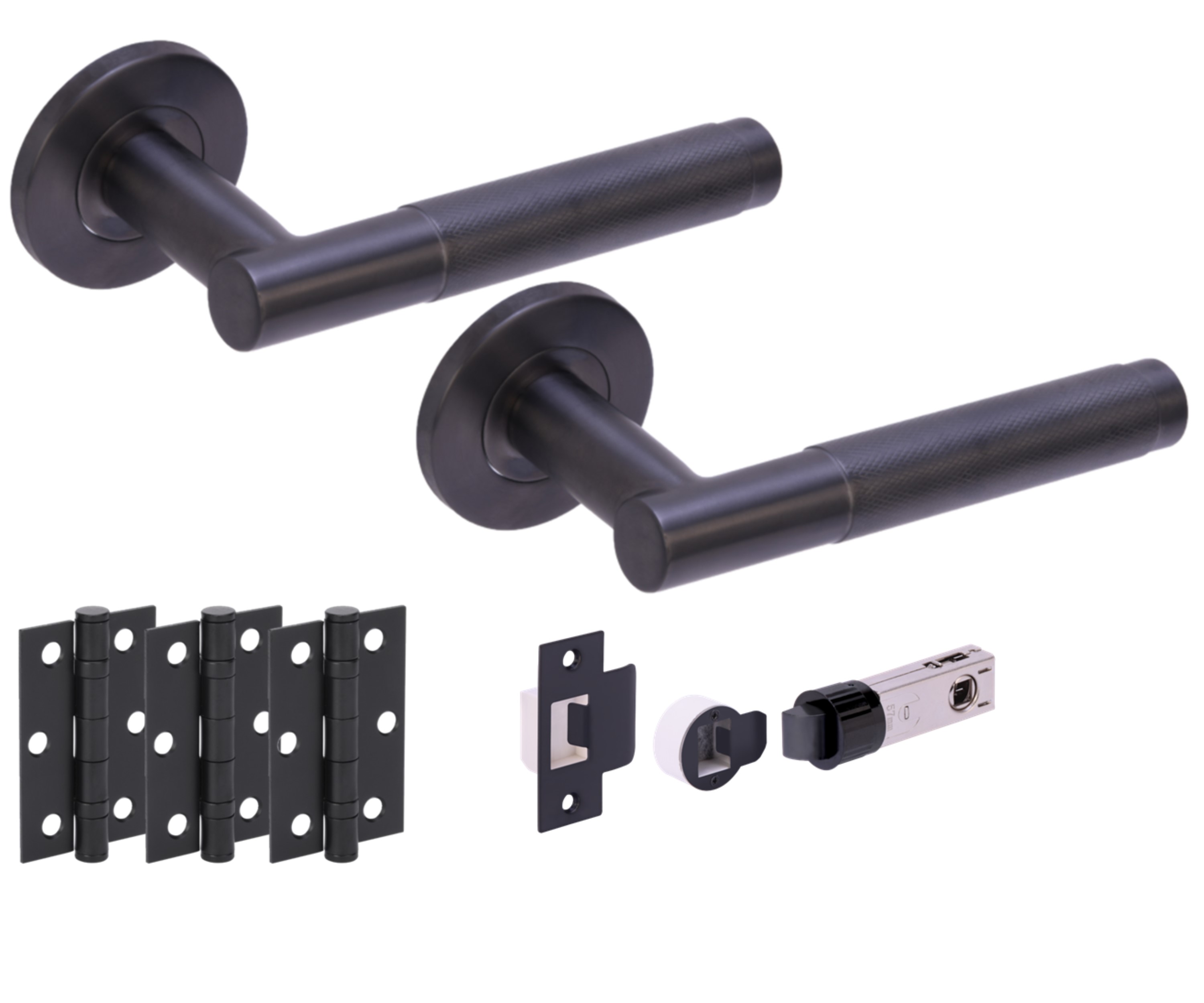 The HUNTA® KOTOR Knurled Graphite Grey Passage Doorpack is a comprehensive door hardware kit designed for interior passage doors, suitable for door thicknesses of 35mm to 44mm. It includes a pair of stylish knurled lever handles made from SUS304 stainless steel, mounted on concealed push-on roses that create a clean look with a diameter of 53mm and a minimal projection of 42mm from the door surface. The levers are finished in a graphite grey color, providing a modern and elegant appearance. Additionally, the kit contains three matching ball bearing hinges and a bullet latch that ensures smooth operation and privacy without locking, making it ideal for non-privacy doors such as closets or hallways. The bullet latch is a unique and sleek alternative to traditional latch styles. Also included is a 100mm HESO spindle and necessary grub screws to secure the lever handles. Bolt through fixings and wood screws are provided for a stable and secure installation. With its premium material construction and sophisticated finish, this door pack is an excellent choice for contemporary home or office interiors.