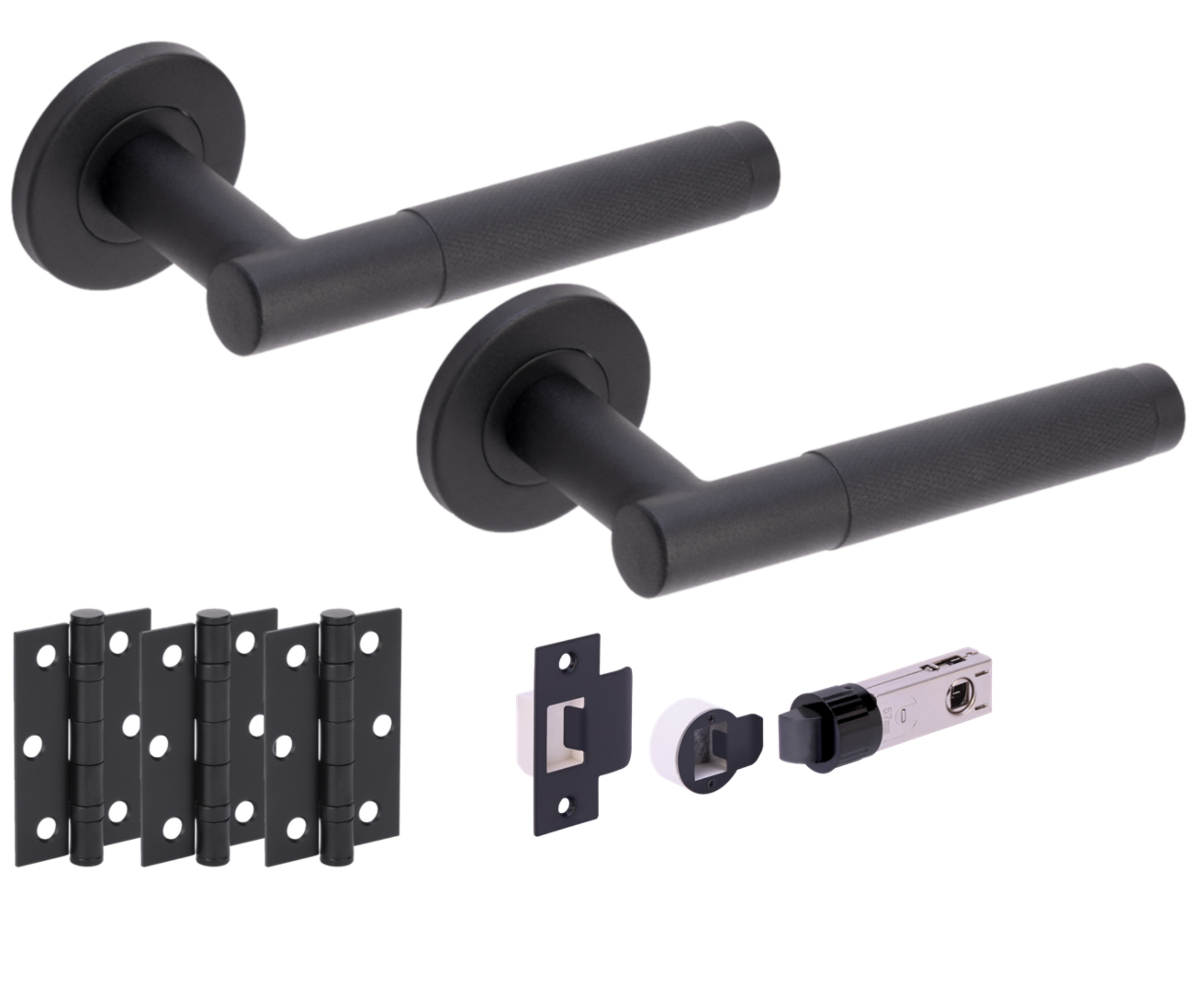 The HUNTA® KOTOR Knurled Matt Black Passage Doorpack is a complete hardware set designed for the installation of a passage door. The kit comprises a stylish passage lever set with a knurled design on the handles, providing an appealing tactile experience and an elegant matt black finish. These levers are made of durable SUS304 steel and are mounted on a stainless steel push-on rose with concealed fixing for a sleek look. The kit includes three bullet-style door hinges that match the lever set’s finish. It also comes with a bullet latch that contributes to the smooth operation of the door. The passage lever set is equipped with M4 x 60mm bolt-through fixing bolts and an 8x8x100mm HESO spindle with M6 grub screws to ensure secure installation on doors ranging from 35mm to 44mm in thickness. Additionally, the kit contains the necessary wood screws for proper mounting. This doorpack is suitable for interior passage doors where privacy is not a priority, with a privacy door pack and other bathroom turn/release sets and escutcheons available for separate purchase to complement different door requirements. The refined look and robust build of this doorpack make it fitting for a variety of residential and commercial settings.