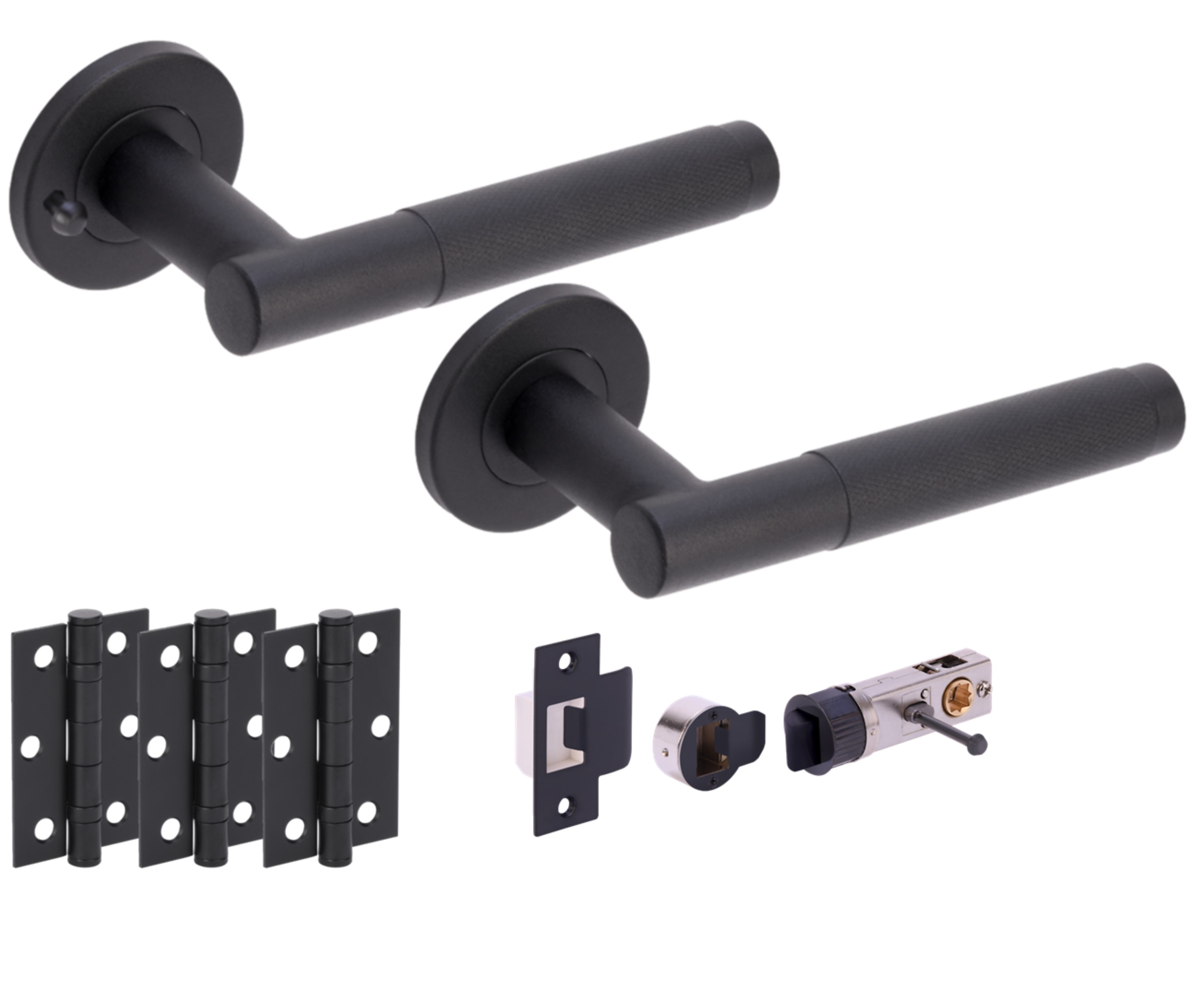 The HUNTA® KOTOR Knurled Matt Black Privacy Doorpack provides a complete solution for installing privacy doors. It features a stylishly designed knurled privacy lever in a matt black finish, offering a sophisticated and contemporary look. The pack is constructed from durable SUS304 steel, ensuring longevity and strength. It includes a set of privacy levers, three ball bearing hinges, and a bullet latch for secure latch operation. This pack is designed for doors with thicknesses ranging from 35mm to 44mm. The privacy levers are 131mm long with a projection of 42mm, providing a comfortable grip. They are mounted on a concealed push-on rose with a diameter and width of 53mm and a thickness of 6mm, which contributes to a clean look with hidden fixings. The lever set is complemented by M4 x 60mm bolt-through fixing bolts for a secure installation. A spindle measuring 8x8x100mm and M6 grub screws is provided to fit the privacy function. A passage door pack version is also available separately. This kit is suitable for creating privacy in residential or commercial spaces such as bathrooms or offices.