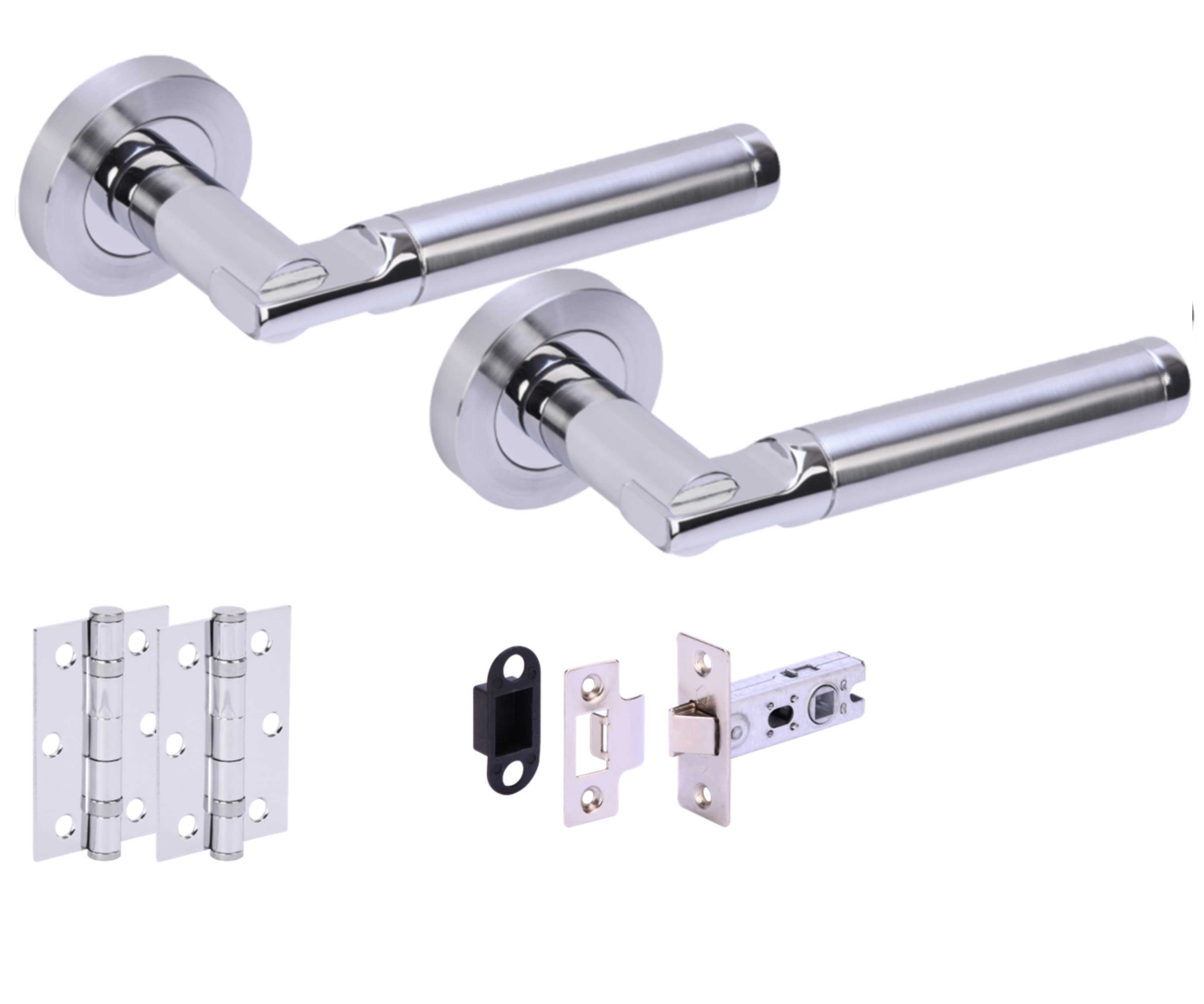 The HUNTA® LACERTA Passage Doorpack kit combines aesthetic appeal with practicality, offering a dual finish of Polished Chrome plating and Satin Chrome plating, suitable for complementing various interior designs. The kit is specifically designed for passage doors, typically not requiring locks, such as interior doors between rooms. The set includes a pair of stylish designer lever handles on a rose, two ball-bearing hinges, and a standard contract latch with a boxed keep. The lever handles are constructed from zinc and feature a concealed screw rose for a sleek look. The bolt through fixing bolts ensure a secure installation on doors ranging from 35mm to 44mm in thickness. Additional accessories like bathroom turn/release sets and escutcheons are available to match this set, making it versatile for various applications.