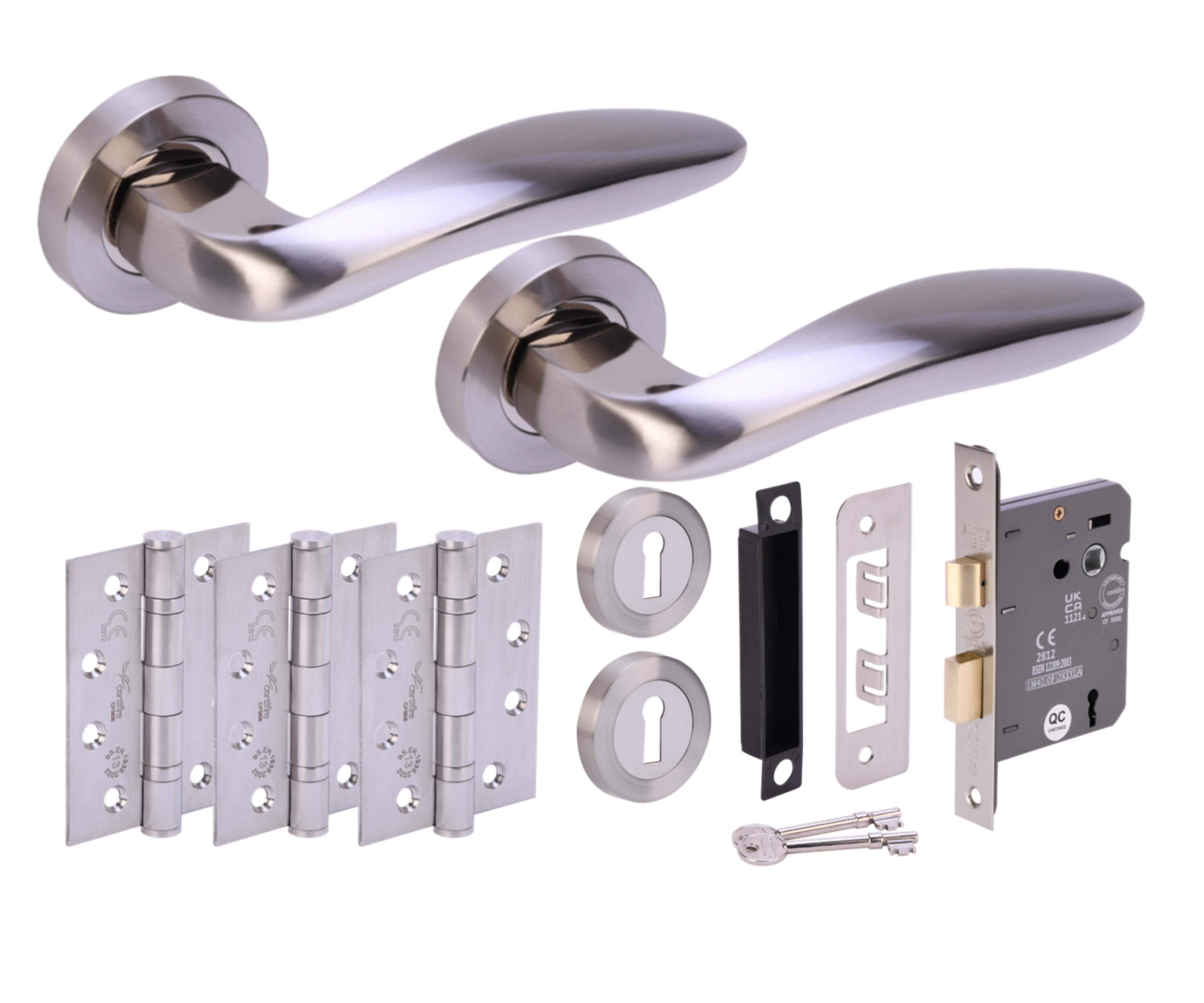 The HUNTA® LAGUS Doorpack is a comprehensive door hardware set that includes a passage lever set, three fire door rated hinges, and a CE marked sashlock with a box keep. The lever handles feature a modern dual finish with polished nickel plating and satin nickel plating, offering an elegant and contemporary look. The lever on the rose design provides a streamlined aesthetic, while bolt through fixing bolts ensure secure attachment to doors. This kit is suitable for door thicknesses ranging from 35mm to 44mm. The hinges provided are 102mm in size and fire door rated, enhancing the safety of the installation. Two matching escutcheons are included for a complete and cohesive look. The lock is CE marked, indicating conformity with European standards, and the kit comprises all necessary fixings including wood screws.